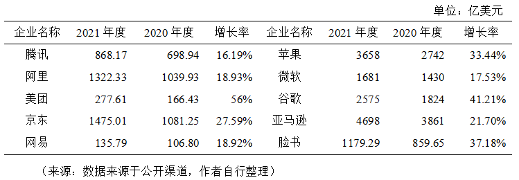 (三)头部数字平台企业营收整体不高。营业收入方面,2021年度我国平台企业营收实现增长。其中京东营业收入1475.01亿美元,同比增长27.59%,阿里营业收入1322.33亿美元,同比增长18.93%,腾讯营业收入868.17亿美元,同比增长16.19%;美国平台企业中亚马逊营业收入4698亿美元,同比增长21.7%,苹果营业收入3658亿美元,同比增长33.44%,谷歌营业收入2575亿美元,同比增长41.21%。我国京东、阿里的营业收入均不足亚马逊的三分之一,且我国前5大平台企业差距较大,美团和网易的营业收入仅为277.61亿美元和135.79亿美元,我国前5大平台企业的平均营业收入不足美国前5大平台企业的30%。