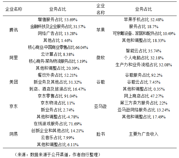 (五)头部数字平台企业营收结构侧重消费者业务。收入结构方面,我国前5大平台企业更依赖电商、游戏、外卖等面向消费者的业务,企业营收仍集中在国内市场,美国前5大平台企业更依赖智能云服务、硬件服务和电商,面向更广阔的全球市场。