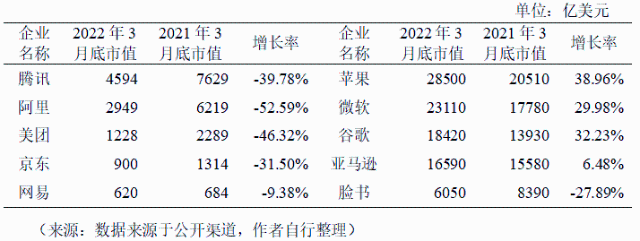 (二)头部数字平台企业市值下滑严重。截至2022年3月底,我国平台企业中市值排名前5位的依次是腾讯、阿里、美团、京东和网易,其中腾讯市值4594亿美元,同比下降39.78%,阿里市值2949亿美元,同比下降52.59%,美团市值1228亿美元,同比下降46.32%,下滑幅度均超过三分之一。美国平台企业中市值排名前5位的依次是苹果、微软、谷歌、亚马逊和脸书,其中苹果市值28500亿美元,同比上涨38.96%,微软市值23110亿美元,同比上涨29.98%,谷歌市值18420亿美元,同比上涨32.23%,上涨幅度均超过四分之一。过去的一年间,中美互联网平台企业的市值差距越来越大。
