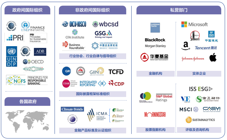 ESG理念和投资原则的迅速传播和应用,关键在于政府间国际组织、非政府间国际组织、公共部门和企业等多元主体共同参与。联合国系统的13家组织或倡议组织(包括UNCTAD、ITC、UNDP、UNEP、WBG、IFC、IMF、UN SSE、UNEP FI、PRI、PSI、PRB、UNGC 等),经济合作与开展组织(OECD)、二十国集团(G20)等重要的国际多边合作组织,都持续有助于ESG政策的制定实行,以亚洲开发银行(ADB)为代表的各地区开发银行也纷纷加强对可持续领域的项目投资力度,有助于地区可持续开展目标的实现。在各类国际组织、政府监管部门、金融组织和实体企业等共同有助于下,ESG逐渐走向标准化、国际化、体系化、全面化,成为了国际资本市场的一种“新规则”。