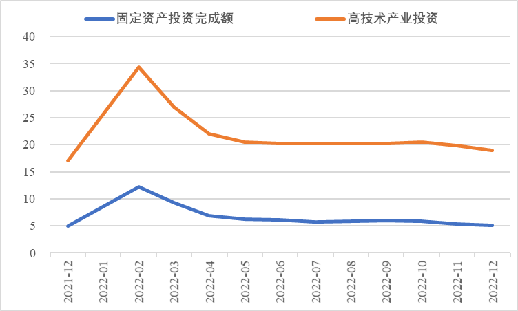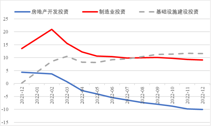 2022年,面对复杂严峻的国际环境和国内疫情挑战,我国投资整体表现较强韧性,对稳定经济基本盘发挥了压舱石作用。基础设施和部分制造业成为稳投资的重点领域,中西部地区投资增长动能强劲。同时,制造业承压加剧、房地产投资下行、地方债高压、社融需求走弱等突出问题制约投资持续稳定增长,稳投资压力仍然较大。实行2023年投资促进工作,关键是把扩大有效投资同优化供给结构有机结合起来,持续扩大高技术产业投资,多举措稳定房地产投资,更好发挥政府投资的引导作用,充分释放社会投资需求潜能。 一、固定资产投资整体运行情况 (一)整体投资韧性超出预期,民间投资呈下行趋势 2022年1—12月,我国固定资产投资(不含农户,下同)572138亿元,同比增长5.1%。一季度投资增速达到9.3%的年内高点,上半年、前三季度分别降至6.1%、5.9%,年初投资增速较高的重要原因是2022年专项债部分限额提前下达等系列政策发挥效果,之后受国外地缘政治冲突、国内疫情多点散发等因素影响,投资增速有所下降,但降幅逐季收窄。一季度、上半年、前三季度、全年固定资产投资增速分别较同期国内生产总值增速高了4.5个、3.6个、2.9个和2.1个百分点,投资成为当前稳定宏观经济大盘的关键力量。 图1 全国固定资产投资增速 (累计同比,%) 数据来源:国家统计局 1—12月,我国固定资产投资三年平均增速为4.3%,低于2019年同期1.1个百分点,全面恢复到疫情前水平仍需一定时间。尤其是民间投资受疫情冲击较为严重,复苏难度较大。一季度、上半年、前三季度、全年民间投资分别同比增长8.4%、3.5%、2%、0.9%,低于整体投资增速0.9个、2.6个、3.9个、4.2个百分点,与整体投资增速的差距逐季拉大。从占比看,截至12月底民间投资累计占固定资产投资的比重已降至54.2%,低于2019年同期2.2个百分点。 图2 民间投资增速及占比(%) 数据来源:国家统计局,Wind数据库 (二)基础设施、制造业投资支撑作用明显,房地产市场持续低迷 制造业投资在外需带动和政策支撑下展现较强韧性,2022年1—12月制造业投资同比增长9.1%,比整体投资高4个百分点。在内需受疫情影响明显收缩的情况下,制造业投资超预期增长很大程度上得益于外需对出口的拉动。我国全年货物出口额累计同比增长10.5%,装备制造、消费品制造等领域海外订单持续旺盛,机电产品占进出口总额的49.1%,汽车出口大幅增长82.2%。技改投资继续发挥对制造业投资的拉动作用。1—11月,制造业企业技改投资同比增长9.1%,占全部制造业投资的比重达40.9%。 基础设施投资在增加政策性开发性金融工具额度、用好专项债等融资支持政策以及各地区各部门持续贯彻落实稳增长系列政策有助于下,陆续在8个月回升,1—12月同比增长9.4%,高于全部投资增速4.3个百分点。其中,水利管理业投资和公共设施管理业投资分别大幅增长13.6%、10.1%。 表1 1-12月我国各行业固定资产投资情况 2022年受需求走弱影响,房地产开发投资增速持续放缓,一季度仅同比增长0.7%,二季度开始滑落至负增长区间。1—12月我国房地产开发投资同比下降10%,降幅较前三季度、上半年分别扩大2个、4.6个百分点,跌幅持续加深,拖累固定资产投资整体增长。房企土地购置费、施工面积、新开工面积等指标均出现持续大幅下降。1—12月,房地产开发景气指数均位于100以下,且自2月以来持续走低。 图3 三大领域固定资产投资增速 (累计同比,%) 数据来源:国家统计局,Wind数据库 高技术产业投资引领作用持续增强。在投资整体下行压力加大的情况下,高技术产业投资逆势而上,稳投资引领作用持续显现。2022年高技术产业投资同比增长18.9%,比全部投资增速高13.8个百分点。分类别看,高技术制造业投资同比增长22.2%,比制造业整体投资高了13.1个百分点,其中电子及通信设备制造业投资增长27.2%,医疗仪器设备及仪器仪表制造业投资增长27.6%,电子、医药制造业投资大幅增加;高技术服务业投资同比增长12.1%,其中科技成果转化服务业投资增长26.4%,研发设计服务业投资增长19.8%,企业研发投入显著加大。 图4 高技术产业投资增速对比整体投资增速 (累计同比,%) 数据来源:国家统计局,Wind数据库 (三)中西部地区投资增长动力较强,东北地区增速止跌回升 2022年1—12月,东部地区投资同比增长3.6%,较前三季度、上半年、一季度分别回落0.7个、0.9个、5.9个百分点;中部地区投资增长8.9%,较前三季度、上半年、一季度分别回落1.1个、1.8个、5.5个百分点;西部地区投资增长4.7%,较前三季度、上半年、一季度分别回落2个、3.3个、6.6个百分点;东北地区投资增长1.2%,较前三季度、上半年、一季度分别提升1个、2.1个、2.6个百分点。总的来看,中部和西部地区投资保持较快增长,东部地区增速较低,东北地区投资在上半年负增长的基础上止跌,呈恢复增长态势。 图5 分地区固定资产投资增速 (累计同比,%) 数据来源:国家统计局,Wind数据库 1—11月,31个省份中有16个省投资增速高于全国水平,其中内蒙古、湖北、宁夏、甘肃等4省实现两位数增长,增速分别达19.8%、15.1%、10.3%、10.2%,投资恢复动力较强。西藏、天津、青海、吉林、海南、贵州、上海、广东、广西等9省出现负增长,分别同比下降23.6%、10.4%、7.8%、3.6%、3%、3%、2.6%、2.6%、0.6%。 表2 1-11月全国各省固定资产投资情况 二、投融资领域存在的主要问题 (一)制造业生产需求两端进一步走弱 20