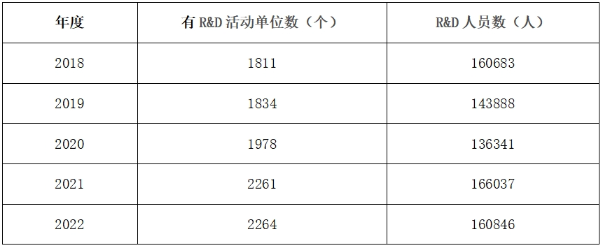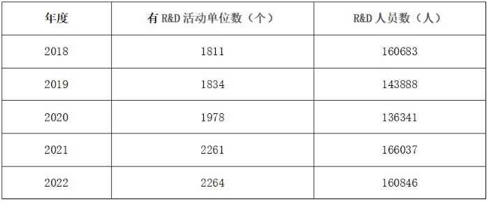 天津市R&D活动单位数量逐年增加,从2018年的1800余个逐步增加到2022年的2200余个,但增长量并不大,其中2021至2022年只增加了3个单位。而R&D人员在2018年至2020年甚至逐年递减,2019年相对2018年的人员数降低了1万6千余人,2020年也降低了7千余人。2020年至2021年人员增加了近3万人,突破了2018年的人员数量,但2022年人员数量又有降低,接近了2018年的R&D人员数。从这一变化趋势可以看出,天津市在吸引人才以及孵化科创企业方面仍然任重道远。