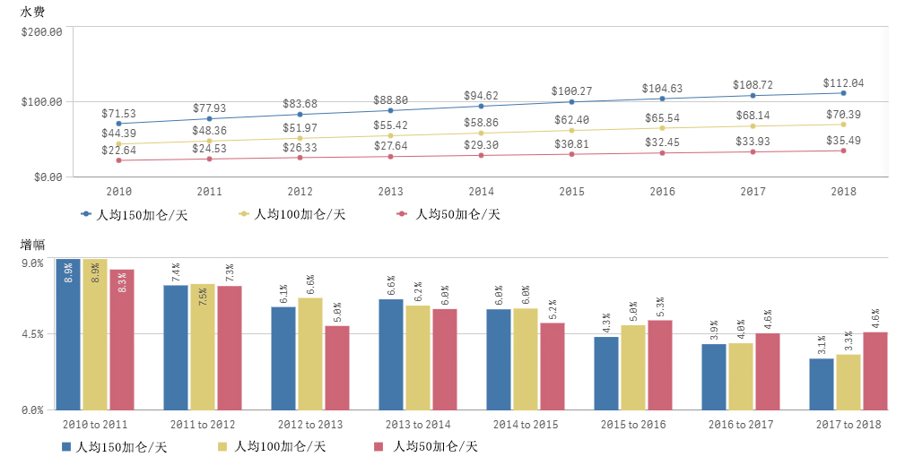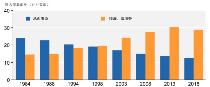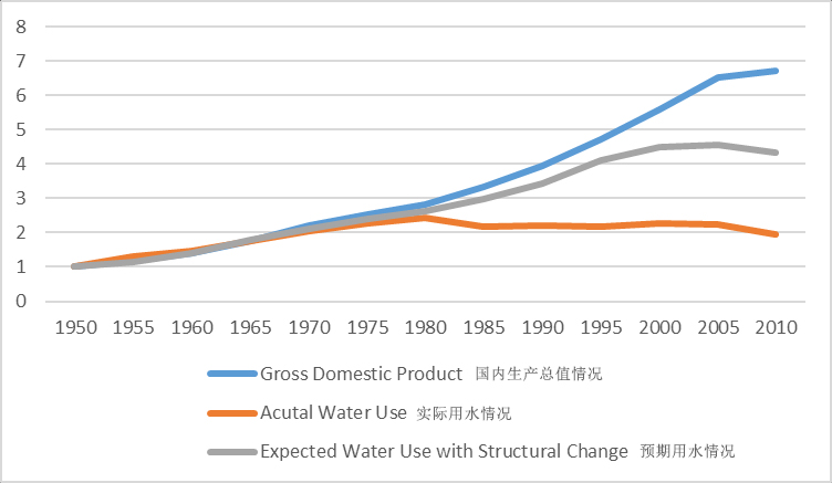 编者按:《2021年联合国世界水开展报告》提出,全球新水使用量在过去100年中增加了6倍,自20世纪80年代以来以每年约1%的速度增加。预计至2050年全球用水量仍将以类似的速度继续增长,且增长主要集中在中低收入国家,尤其是新兴经济体[1]。 为进一步把握好我国水资源未来需求趋势,我们深入分析研究了一些典型国家的用水态势变化情况及水资源管理经验,以期为我国实行水资源需求研判以及科学指导水工程规划建设给予参考。本公众号将研究成果以系列文章的方式陆续刊发,本文为系列研究之一,供业界同仁参考。 美国用水变化态势对我国的启示 姜富华 邢智慧 纪兴华 一、1950年以来美国用水量变化态势分析 (一)1950年以来美国用水量变化情况 2015年美国总用水量约为4449亿立方米,其中淡水约为3883亿立方米,占比为87%;咸水约为566亿立方米,占比为13%。 从1950年至2015年间美国总用水量的变化情况看,其总体呈先增后降的态势(见图1)。以1980年为转折点,1950-1980年间美国总用水量随着人口和经济的增长持续增长,1980年美国总用水量约为1950年的2.4倍;1980年以后,受产业结构调整、技术进步、用水效率提高等因素综合影响,美国总用水量呈现了总体下降的态势,2015年总用水量比用水高峰的1980年减少了约25%。 美国淡水取用量与总用水量变化态势一致(见图2)。1980-2015年间美国淡水总用水量下降了27%,此期间美国人口增长了约42%,GDP增长了5倍以上[2]。 数据来源:美国地质调查局统计。 注:①不同时段取水量统计口径略有差异;②取水量等于毛用水量。 图1 1950-2015年美国总取用水量及分类取用水量变化态势 数据来源:美国地质调查局统计。 图2 1950-2015年美国淡水取用水量与人口变化态势 有研究[3]绘制了以1950年为基准,至2010年美国GDP与用水量间的关系变化情况图(见图3)。蓝色线为实际GDP变化,橙色线为实际用水量变化,灰色线为考虑产业结构变化、不考虑技术改进情况下的预测用水变化。蓝色线与橙色线的剪刀走向表明:早在1980年,美国用水量已与GDP脱钩。蓝色线与灰色线、灰色线与橙色线的剪刀走向表明:导致脱钩的重要因素是用水效率提升和经济结构变化。 数据来源:数据来自[3];1950=1 图3 1950-2010年美国总用水量与经济变化关系分析 (二)主要行业用水量变化情况 美国用水类别中,热电、灌溉、公共和自供工业用水量是排在前4名的用水户,其用水总量占美国总用水量的比重超过90%,见图4。本文重点分析多年来美国热电、灌溉、公共和自供工业用水的变化情况。 数据来源:美国地质调查局。 图4 2015年美国分类取用水量统计 1.热电用水变化态势 热电是美国最大的用水对象。2015年美国热电用水量约为1838亿立方米,占总用水量的41%左右,见图5。美国热电用水基本来自地表水,且以淡水为主。2015年美国热电用水量比2010年降低18%左右,用水效率由2010年的71.9升/千瓦时降低到2015年的56.8升/千瓦时。 数据来源:美国地质调查局。 图5 1950-2015年美国热电用水量变化态势 2.灌溉用水变化态势 美国灌溉用水量占总用水量的40%左右,仅次于热电用水。2015年美国灌溉面积超过3.5亿亩,其中喷灌、微灌面积比重分别为55%和8.6%左右,灌溉总用水量约为1630亿立方米(占总用水量的37%左右),地表和地下水源灌溉供水比重分别为52%和48%。由于降雨丰枯变化,美国灌溉水量年际间有波动,但从大的变化趋势看,1980年以来总体呈下降趋势,2015年灌溉水量比1980年减少了21%,见图6。 数据来源:美国地质调查局。 图6 1950-2015年美国灌溉用水量变化态势 灌溉用水受水资源条件、灌溉面积、种植结构、灌溉设施、灌溉效率等多种因素影响。据美国农业部统计,美国灌溉面积快速增长,从1890年的不足1821万亩增长到2017年的3.52亿亩左右,见图7。但与此同时,实际灌溉用水强度有所下降,1969-2017年单位面积平均灌溉水量从406立方米/亩下降至304立方米/亩,这是农业种植模式调整、灌溉设施与技术采用和灌溉效率提高等综合作用的结果。 数据来源:美国农业部。 图7 1890-2018年美国灌溉面积和单位面积灌溉用水量变化态势 美国灌溉用水结构不断变化,主要表现为玉米和大豆的灌溉面积显著增加。1964年美国主要灌溉农作物是棉花和牧草,玉米和大豆加起来不到1518万亩。2017年玉米灌溉面积超过7284万亩,大豆灌溉面积超过5463万亩,见图8。 数据来源:美国农业部。 图8 1964-2017年美国主要农作物灌溉面积变化态势 同时,美国越来越注重高效节水灌溉技术的运用。美国农业灌溉主要集中在西部17州。1984年美国西部17州露天灌溉农田中使用高效节水灌溉系统的比重为37%,2018年该比例提高至72%,见图9。 数据来源:美国农业部。 图9 1984-2018年美国西部17州露天农田灌溉模式变化态势 3.公共用水量变化态势 美国公共供水对象主要包括家庭、商业和工业,以及部分公共服务用水等。2015年美国公共供水量约为539亿立方米(其中地表水源供水比重约为61%),占供水总量的12%左右。1950年以来,美国公共供水与总用水量、灌溉等用水总体呈先增后降的态势一样,但高峰用水出现时间后延至2005年,2015年美国公共供水量较2005年减少12.2%,见图10。公共供水中家庭供水比重最大,接近60%。 数据来源:美国地质调查局。 图10 1950-2015年美国公共供水量变化态势 美国家庭供水水源除了来自公共供水系统外,部分供水由自供设施解决。2015年美国顺利获得公