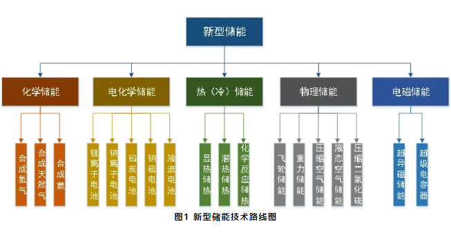 新型储能按照技术路线可划分为电化学储能(锂离子电池、钠离子电池、铅炭电池、液流电池、钠硫电池等)、机械储能(压缩空气、液态空气、飞轮、重力储能等)、电磁储能(超级电容器、超导磁储能等)、化学储能(合成氢气、天然气等)、热(冷)储能(熔盐储热、冰蓄冷等)等几十种不同的储能技术(如图1)。2023年,全国已投运新型储能中锂离子电池占比97.4%,铅炭(酸)电池占比0.5%,压缩空气储能占比0.5%,液流电池储能占比0.4%,飞轮等其他技术占比1.2%。全球首座非补燃盐穴压缩空气储能电站、百兆瓦先进压缩空气储能电站、百兆瓦全钒液流电站、商业化重力储能电站、商业化二氧化碳压缩储能电站,全球规模最大的非补燃压缩空气储能电站(300兆瓦/1500兆瓦时)、全钒液流储能电站(100兆瓦/500兆瓦时)、液态压缩空气储能电站(60兆瓦/60兆瓦时)、铅炭电池储能电站(100兆瓦/1061兆瓦时)等不同技术路线的“世界之最”项目均在我国开工、投运,我国已然成为全球新型储能技术落地验证的“热土”。