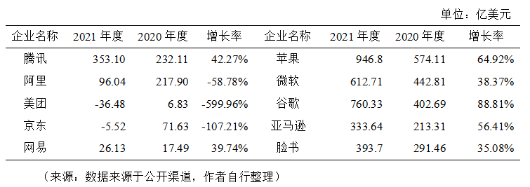 (三)头部数字平台企业营收整体不高。营业收入方面,2021年度我国平台企业营收实现增长。其中京东营业收入1475.01亿美元,同比增长27.59%,阿里营业收入1322.33亿美元,同比增长18.93%,腾讯营业收入868.17亿美元,同比增长16.19%;美国平台企业中亚马逊营业收入4698亿美元,同比增长21.7%,苹果营业收入3658亿美元,同比增长33.44%,谷歌营业收入2575亿美元,同比增长41.21%。我国京东、阿里的营业收入均不足亚马逊的三分之一,且我国前5大平台企业差距较大,美团和网易的营业收入仅为277.61亿美元和135.79亿美元,我国前5大平台企业的平均营业收入不足美国前5大平台企业的30%。
