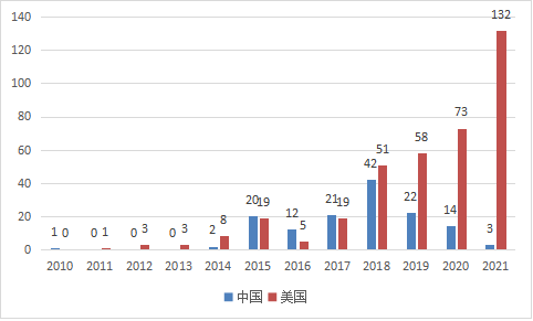 (六)独角兽企业数量增长明显减速。无论是独角兽企业的新增数量还是准独角兽企业的形成数量,我国都滞后于美国甚至印度。2018年以来的中美贸易摩擦以及2021年初以来的平台经济“强监管”政策都加速了新增独角兽公司的数量的全球分化。根据最新榜单,中国的新兴独角兽公司有27家,落后于印度的32家,2021年中国新增独角兽企业仅3家,明显落后于美国的132家。在全球数字经济的竞争格局中“不进则退”。