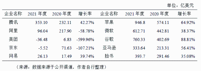 (四)头部数字平台企业利润出现持续下滑。利润方面,2021年度我国平台企业利润下滑严重,其中美团和京东出现了净亏损。具体来看,美团亏损36.48亿美元,同比下降599.96%,京东亏损5.52亿美元,同比下降107.21%,阿里净利润为96.04亿美元,同比下降58.78%;美国平台企业中苹果净利润946.8亿美元,同比增长64.92%,谷歌净利润760.33亿美元,同比增长88.81%,微软净利润612.71亿美元,同比增长38.37%,亚马逊和脸书的净利润均超过300亿美元。我国前5大平台企业的平均净利润不足美国前5大平台企业的15%。