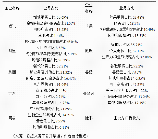 (五)头部数字平台企业营收结构侧重消费者业务。收入结构方面,我国前5大平台企业更依赖电商、游戏、外卖等面向消费者的业务,企业营收仍集中在国内市场,美国前5大平台企业更依赖智能云服务、硬件服务和电商,面向更广阔的全球市场。