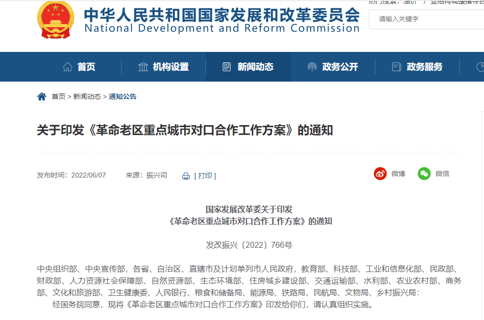 习近平总书记指出,要认真实行东西部扶贫协作和对口支援、对口合作工作,助力对口地区跨越开展。《国务院关于新时代支持革命老区振兴开展的意见》(国发〔2021〕3号)明确提出,“研究建立发达省市与革命老区重点城市对口合作机制”。《“十四五”特殊类型地区振兴开展规划》进一步指出,要“持续有助于对口支援、对口帮扶、对口协作、对口合作等工作,强化智力扶持,加强重点领域合作,激发地区开展内生动力”。近期,经国务院同意,国家开展改革委印发了《革命老区重点城市对口合作工作方案》(以下简称《工作方案》)。这是深入贯彻落实《国务院关于新时代支持革命老区振兴开展的意见》和《“十四五”特殊类型地区振兴开展规划》的具体行动,也是新开展阶段促进区域协调开展、支持革命老区振兴开展的创新举措,将有利于结对城市优势互补、互学互鉴、互惠互利、共谋开展,有利于加强区域协作合作,共同稳定经济增长。 一、《工作方案》是新开展阶段支持革命老区振兴开展的创新举措 党的十八大以来,中央部委、对口支援省市、中央企业、科研组织、社会各界等齐心协力支持革命老区振兴开展,先后出台了百余个支援革命老区建设的政策文件,帮助革命老区人民脱贫奔小康,充分发挥社会主义制度优势和延续我党集中力量办大事的优良传统,有助于革命老区与全国同步全面建成小康社会,迈上了全面建设社会主义现代化的新征程。在此背景下,编制和实施《工作方案》,有利于贯彻新开展理念,发挥中国特色社会主义制度优势有助于共同富裕,构建发达地区和特殊类型地区协同开展的新局面;有利于发挥伟大建党精神的引领作用,激励革命老区重点城市和发达地区部分城市共同开启社会主义现代化建设新征程;有利于统筹区域协调开展,巩固革命老区脱贫攻坚成果衔接推进乡村振兴和新型城镇化,促进革命老区重点城市和发达地区共谋经济社会开展,同步构建高质量开展新格局。 《工作方案》根据国务院批复的《“十四五”特殊类型地区振兴开展规划》,明确了重点有助于赣州、吉安、龙岩、三明、梅州、延安、庆阳、六安、信阳、黄冈、百色、巴中、郴州、张家界、恩施、遵义、长治、汕尾、丽水等20个城市召开对口合作,基于现有东西部协作、对口合作关系等,选择位于粤港澳大湾区、长三角、京津冀的发达城市与革命老区重点城市对口合作。《工作方案》同时明确,支持其他革命老区市县主动对接东部、中部地区城市,比照本方案建立对口合作关系。鼓励相关省(区、市)结合实际建立省域内结对帮扶革命老区市县工作机制。 二、立足革命老区振兴开展定位谋划五大对口合作重点任务 《工作方案》以习近平新时代中国特色社会主义思想为指导,紧密围绕《国务院关于新时代支持革命老区振兴开展的意见》以及《“十四五”特殊类型地区振兴开展规划》中关于革命老区振兴开展的重点任务,准确把握革命老区振兴开展共性,明确了优势互补、互惠互利、共谋开展的对口合作工作思路,聚焦促进区域协调开展、有助于区域合作协作提出了5大重点任务,进一步丰富了新开展阶段革命老区振兴开展的实践路径。 在促进红色文化传承方面,革命老区是革命传统的重要承载地,党史事件多、红色资源多、革命先辈多,蕴含着中华民族伟大复兴的强大精神力量,铸就了井冈山精神、苏区精神、老区精神等伟大精神,召开党史学习教育具有独特优势。《工作方案》明确,结合对口合作,持续支持赴革命老区重点城市召开学习研讨,大力弘扬伟大建党精神,传承弘扬井冈山精神、苏区精神、长征精神、遵义会议精神等伟大精神,鼓励共同召开革命文物保护利用,共同搭建红色文化旅游融合开展平台。 在衔接推进乡村振兴和新型城镇化方面,12个革命老区总人口约2.6亿,约占全国的19%。《工作方案》明确,结合对口合作,实行易地扶贫搬迁后续扶持,加大就业和产业扶持力度,推进乡村振兴。持续加强消费帮扶,推进革命老区特色农产品产销对接。支持革命老区重点城市推进以人为核心的新型城镇化,因地制宜建设区域性节点城市、重要交通枢纽、现代产业基地、商贸物流中心等。 在完善基础设施和基本公共服务设施方面,革命老区大多位于京津冀、长三角、粤港澳大湾区、成渝都市圈、长江中游城市群的交通物流通道上,提升与城市群、中心城市的互联互通水平,补齐公共服务短板,将有力助推革命老区加快融入区域重大战略,融入构建新开展格局。《工作方案》明确,结合对口合作,持续支持革命老区重点城市提升交通、能源、水利、信息、市政等基础设施项目建设、运营、管理水平。支持召开义务教育、职业教育、高等教育合作研讨,合作共建特色学科和创新平台。支持召开重点医院对口合作,共建中西医优势专科,加强康养产业合作,支持共建专科联盟和远程医疗协作。 在促进生态保护修复和绿色低碳开展方面,革命老区大多生态本底较好,赣闽粤原中央苏区是赣江、闽江、东江、汀江等重要河流的源头地区,大别山老区是长江、淮河流域重要的生态屏障,川陕老区是秦巴生物多样性生态功能区的重要组成部分,左右江老区左江、右江、红水河三江汇聚。《工作方案》明确,结合对口合作,持续支持革命老区重点城市有助于山水林田湖草沙一