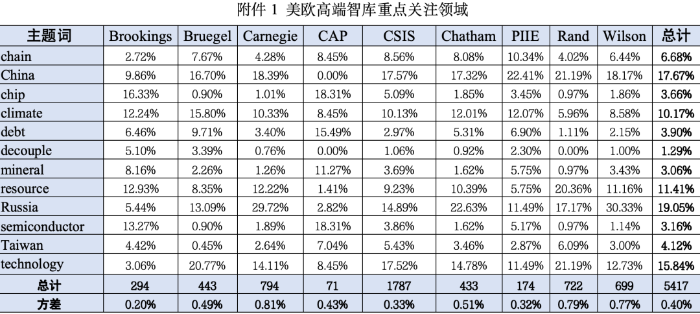 一、研究背景 美欧智库是全球智库体系中的重要组成部分,其开展起步较早,开展模式较好,行业规范更成熟,是美欧国家的重要政策智囊,在全球高端舆论体系中有着重要的地位。总体来看,美欧智库在数量和影响力方面处于世界领先地位,其发布的观点、分析和评论也成为了当下分析美欧国家政府内部认知和社会公共舆论的一扇重要窗口。 一般对于智库的研究报告都以文献阅读、分析、总结为主,多针对一篇或几篇报告进行分析。这种研究方式的优势是分析更为透彻和深入,但是由于个人精力、关注方向的局限性,容易陷入“信息茧房”,对整体方向的把握比较散乱。本报告属于美欧智库成果大数据研究系列,旨在持续跟踪美欧智库研究动向,更全面分析美欧国家对国际政治、经济贸易、中国开展等关键领域的认知情况。 二、样本选取 研究样本选取美国布鲁金斯学会(Brookings)、美国卡内基国际和平基金会(Carnegie)、比利时布鲁盖尔研究所(Bruegel)、美国战略与国际问题研究中心(CSIS)、英国皇家国际事务研究所(Chatham)、美国兰德公司(Rand)、美国彼得森国际经济研究所(PIIE)、威尔逊中心(Wilson)和美国进步中心(CAP)等9家智库。 样本报告研究覆盖关于中国、产业链、芯片、气候、债务、脱钩、矿物、资源、俄罗斯、半导体、台湾、技术等相关领域的研究报告,共计5417篇。 三、文本数据分析 (一)各智库关注领域 2023上半年,各欧美智库与中国、俄罗斯等相关的主题报告占比在五分之二左右,与供应链、芯片产业、半导体产业、矿产产业、脱钩等相关的主题报告占比在五分之一左右,与气候、资源、债务等相关的主题报告占比约五分之一,与台湾、科技主题相关的报告约占五分之一。不同主题下智库关注的重点领域分析参见附件1。 1.布鲁盖尔:中国和科技 布鲁盖尔研究所注重中国问题和科技前沿产业的研究。在限制中国科技开展的问题上,布鲁盖尔指出,越来越多的研究员担心美国在基础研究方面的开放可能过于支持竞争对手。随着科技水平在一些关键领域取得的重大突破、全球化信息环境的形成、以及国际经济联系的深化和多样化,各国的相互依存将不可分离,高技术产业针对某一国家和地区进行全面封锁将愈加困难。在科技前沿产业研究中,布鲁盖尔对由国防部、联合作战指挥部、海军、海军陆战队、国防组织和国防情报部门联合资助的兰德公司国防研究所进行了重点分析,认为美国应继续顺利获得军工联合体推进前沿科技转化的研究工作。 2.布鲁金斯:芯片和资源 布鲁金斯学会的研究领域较为广泛,其研究相对侧重芯片和资源。布鲁金斯认为美国利用其在国际组织如多边开发银行中的股权影响力,支持美国在外交、安全和经济方面的政策和活动,特别是对芯片技术的封锁。布鲁金斯顺利获得对关键矿产供应问题的大量分析,如美国和日本宣布的关于电池矿物采购、美国对加拿大矿业项目的融资贸易协议,提出应加强关注部分关键产业供应链上游矿产品,现在美国部分利益团体已经加强该类产品的供应安全,对相关风险有所警惕和防范。 3.卡内基:中国和俄罗斯 卡内基国际和平基金会的研究具有鲜明的特色,以俄罗斯、中国问题为研究重点,相关报告约占其研究报告总量的一半。针对俄罗斯,卡内基提出现在正在美国执行的三大举措包括加强对乌克兰的战争支持、维持对俄罗斯的制裁和加强北约的东部防线,成功搭建了遏制俄罗斯开展的政策框架,未来应立足这三大核心进一步强化对俄政策。围绕乌克兰提出的《基辅安全协议保障草案》,美国仍在权衡是否将现在的支持转化为更持久的框架。卡内基提出,美国对乌克兰的军事援助已经在美国政府内部产生争议,特别是美国总统选举即将到来的窗口期日益临近,各个候选人团队会在这段时间重新研究对乌援助计划,以争取选民和国内各势力的最大限度支持。针对中国,卡内基多名研究员提出拜登政府的国家安全战略将中国作为最重要的地缘政治挑战,未来会加强澳大利亚、英国和美国组成的三方安全伙伴关系,将其逐步培养成印太地区最强大的军事力量之一。 4.兰德:中国、俄罗斯和科技 兰德公司延续了其对中国、俄罗斯和科技前沿的关注。兰德重点分析和权衡了中俄战略地位,虽然短期内美国由于乌克兰战争而全面回归欧洲安全事务,但是长期来看美国的战略关注重点仍然是中国。同时,部分研究提出对乌克兰的援助不仅是对一个主权国家生存空间的支持,也可以将乌克兰视为一个潜在的投资目的地,将乌克兰作为战略合作伙伴召开经济贸易等领域的合作,以经济利益来缓解国会中怀疑的声音,换取更多国内利益相关团体的支持。在科技领域,兰德公司从俄乌战争需求的角度对部分前沿科技进行分析,如在网络安全领域,美国的一些私营部门为乌克兰政府给予了关键的网络安全技术支持,大大削弱了俄罗斯的网络攻击效力。 5.战略与国际问题研究中心:科技和俄罗斯 CSIS的关注重点是科技和俄罗斯问题。在科技领域,CSIS提出加强对量子技术的研究。现在量子技术仍处于初级阶段,但战略意义重大,中国已经在相关领域占据优势,特朗普和拜登政府以及过去几届国会都采取了持续措施促进其开展,在未来几十年中是重要的科技开展方向。在俄罗斯问题上,CSIS指出油业税改是普京上台后的首个重要经济