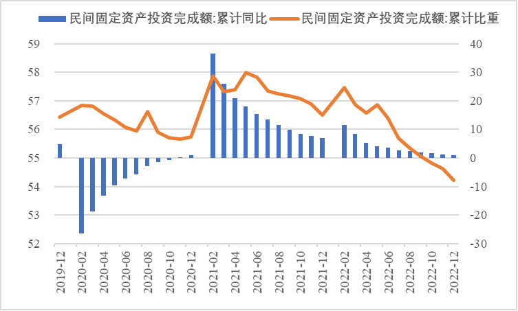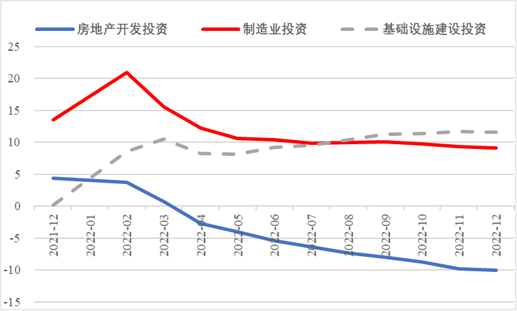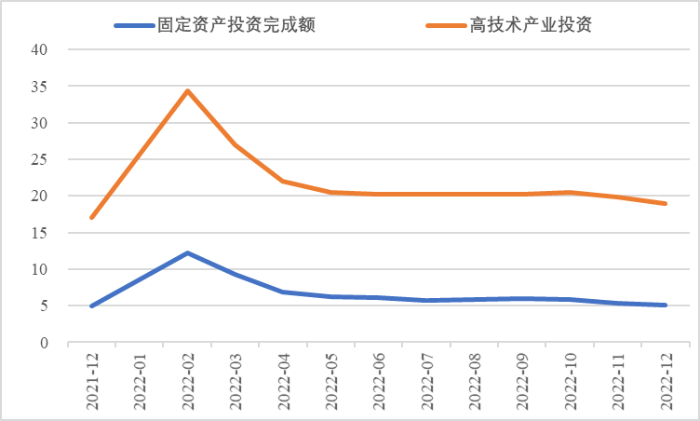 2022年,面对复杂严峻的国际环境和国内疫情挑战,我国投资整体表现较强韧性,对稳定经济基本盘发挥了压舱石作用。基础设施和部分制造业成为稳投资的重点领域,中西部地区投资增长动能强劲。同时,制造业承压加剧、房地产投资下行、地方债高压、社融需求走弱等突出问题制约投资持续稳定增长,稳投资压力仍然较大。实行2023年投资促进工作,关键是把扩大有效投资同优化供给结构有机结合起来,持续扩大高技术产业投资,多举措稳定房地产投资,更好发挥政府投资的引导作用,充分释放社会投资需求潜能。 一、固定资产投资整体运行情况 (一)整体投资韧性超出预期,民间投资呈下行趋势 2022年1—12月,我国固定资产投资(不含农户,下同)572138亿元,同比增长5.1%。一季度投资增速达到9.3%的年内高点,上半年、前三季度分别降至6.1%、5.9%,年初投资增速较高的重要原因是2022年专项债部分限额提前下达等系列政策发挥效果,之后受国外地缘政治冲突、国内疫情多点散发等因素影响,投资增速有所下降,但降幅逐季收窄。一季度、上半年、前三季度、全年固定资产投资增速分别较同期国内生产总值增速高了4.5个、3.6个、2.9个和2.1个百分点,投资成为当前稳定宏观经济大盘的关键力量。 图1 全国固定资产投资增速 (累计同比,%) 数据来源:国家统计局 1—12月,我国固定资产投资三年平均增速为4.3%,低于2019年同期1.1个百分点,全面恢复到疫情前水平仍需一定时间。尤其是民间投资受疫情冲击较为严重,复苏难度较大。一季度、上半年、前三季度、全年民间投资分别同比增长8.4%、3.5%、2%、0.9%,低于整体投资增速0.9个、2.6个、3.9个、4.2个百分点,与整体投资增速的差距逐季拉大。从占比看,截至12月底民间投资累计占固定资产投资的比重已降至54.2%,低于2019年同期2.2个百分点。 图2 民间投资增速及占比(%) 数据来源:国家统计局,Wind数据库 (二)基础设施、制造业投资支撑作用明显,房地产市场持续低迷 制造业投资在外需带动和政策支撑下展现较强韧性,2022年1—12月制造业投资同比增长9.1%,比整体投资高4个百分点。在内需受疫情影响明显收缩的情况下,制造业投资超预期增长很大程度上得益于外需对出口的拉动。我国全年货物出口额累计同比增长10.5%,装备制造、消费品制造等领域海外订单持续旺盛,机电产品占进出口总额的49.1%,汽车出口大幅增长82.2%。技改投资继续发挥对制造业投资的拉动作用。1—11月,制造业企业技改投资同比增长9.1%,占全部制造业投资的比重达40.9%。 基础设施投资在增加政策性开发性金融工具额度、用好专项债等融资支持政策以及各地区各部门持续贯彻落实稳增长系列政策有助于下,陆续在8个月回升,1—12月同比增长9.4%,高于全部投资增速4.3个百分点。其中,水利管理业投资和公共设施管理业投资分别大幅增长13.6%、10.1%。 表1 1-12月我国各行业固定资产投资情况 2022年受需求走弱影响,房地产开发投资增速持续放缓,一季度仅同比增长0.7%,二季度开始滑落至负增长区间。1—12月我国房地产开发投资同比下降10%,降幅较前三季度、上半年分别扩大2个、4.6个百分点,跌幅持续加深,拖累固定资产投资整体增长。房企土地购置费、施工面积、新开工面积等指标均出现持续大幅下降。1—12月,房地产开发景气指数均位于100以下,且自2月以来持续走低。 图3 三大领域固定资产投资增速 (累计同比,%) 数据来源:国家统计局,Wind数据库 高技术产业投资引领作用持续增强。在投资整体下行压力加大的情况下,高技术产业投资逆势而上,稳投资引领作用持续显现。2022年高技术产业投资同比增长18.9%,比全部投资增速高13.8个百分点。分类别看,高技术制造业投资同比增长22.2%,比制造业整体投资高了13.1个百分点,其中电子及通信设备制造业投资增长27.2%,医疗仪器设备及仪器仪表制造业投资增长27.6%,电子、医药制造业投资大幅增加;高技术服务业投资同比增长12.1%,其中科技成果转化服务业投资增长26.4%,研发设计服务业投资增长19.8%,企业研发投入显著加大。 图4 高技术产业投资增速对比整体投资增速 (累计同比,%) 数据来源:国家统计局,Wind数据库 (三)中西部地区投资增长动力较强,东北地区增速止跌回升 2022年1—12月,东部地区投资同比增长3.6%,较前三季度、上半年、一季度分别回落0.7个、0.9个、5.9个百分点;中部地区投资增长8.9%,较前三季度、上半年、一季度分别回落1.1个、1.8个、5.5个百分点;西部地区投资增长4.7%,较前三季度、上半年、一季度分别回落2个、3.3个、6.6个百分点;东北地区投资增长1.2%,较前三季度、上半年、一季度分别提升1个、2.1个、2.6个百分点。总的来看,中部和西部地区投资保持较快增长,东部地区增速较低,东北地区投资在上半年负增长的基础上止跌,呈恢复增长态势。 图5 分地区固定资产投资增速 (累计同比,%) 数据来源:国家统计局,Wind数据库 1—11月,31个省份中有16个省投资增速高于全国水平,其中内蒙古、湖北、宁夏、甘肃等4省实现两位数增长,增速分别达19.8%、15.1%、10.3%、10.2%,投资恢复动力较强。西藏、天津、青海、吉林、海南、贵州、上海、广东、广西等9省出现负增长,分别同比下降23.6%、10.4%、7.8%、3.6%、3%、3%、2.6%、2.6%、0.6%。 表2 1-11月全国各省固定资产投资情况 二、投融资领域存在的主要问题 (一)制造业生产需求两端进一步走弱 20