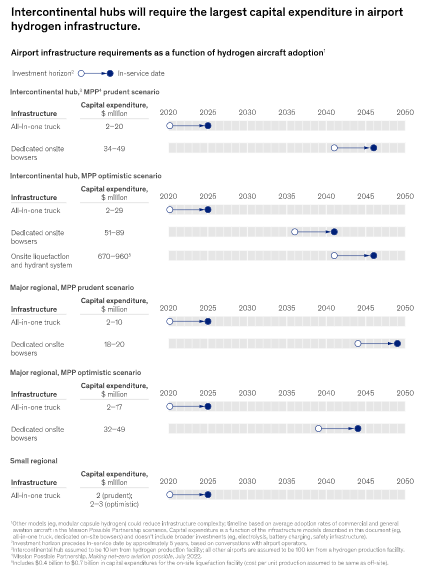 01 转向新型生产的基础设施 航空业对清洁能源的需求可能已飙升到新的高度。研究人员估算了2050年支持使用新型推进系统的飞机所需的能源需求,研究了对航空基础设施的影响。 需要大量的清洁能源来满足需求 到2050年,电池电力和氢动力飞机可能占飞机的21%-38%,占该行业整体需求的15%-34%。到2050年,全球新型推进器可能需要600-1700太瓦时的清洁能源,相当于全球10-25个最大的风力发电场产生的能量。大约89%-96%的能源将用于氢动力的飞机,而只有4%-11%的能源将用于驱动较小的电池电力飞机,如涡轮螺旋桨飞机、支线喷气机和较小的窄体飞机。(见图1) 图1 到2050年,氢动力飞机预计占航空产业新型推进器电力需求的89%-96% 大型机场能源消耗增加 随着新型推进系统的普及,机场的现场运作将比现在需要更多的能源。对于一个希望投资于现场氢气液化,为电池电动飞机充电的大型枢纽机场来说,航站楼、地面支持和其他用途的现场总耗电量可能在每年1250至2450千兆瓦时之间,这比伦敦希斯罗机场现在消耗的电力多5至10倍。为了满足这些需求,机场需要采取措施,升级电网连接、当地配电基础设施和自己的发电站。 两个新的基础设施价值链 新型推进器需要两个新的基础设施价值链,一个涉及电池电力驱动的航空,另一个是氢动力航空。这些价值链可能包括许多现在不属于航空生态系统的新伙伴,它们将与可持续航空燃料和传统燃料所需的基础设施共存。该产业需要新的能源获取、储存、处理和管理程序,以及向飞机分配能源的方式。 为清洁能源发电给予更多空间 大多数机场都有用于氢气液化和储存基础设施的空间,但没有足够的土地来产生顺利获得电池电力和氢气的方式为飞机给予动力所需的清洁能源。虽然机场被追捧为潜在的能源中心,但新型推进器的能源需求规模会让在机场进行所有能源生产变得极为困难。根据“可行使命伙伴关系”较为审慎地设想,以巴黎戴高乐机场为例,作为一个主要国际枢纽,它将需要大约5800公顷的太阳能电池板来产生足够的电力以满足其需求。现在该机场占地3300公顷,这远远超过了机场本身的规模。鉴于如此巨大的空间需求,大多数机场可能会依靠与区域生态系统内的其它电力供应商合作来满足这些需求。 02 投资新型有助于基础设施 交付新型推进器所需的机场内外基础设施将需要机场和其他利益相关方的大量投资。研究人员的分析发现了与这些投资有关的多种洞见。 对新型推进器价值链的投资 到2050年,转向替代性推进器需要在整个价值链中投入7000亿至1.7万亿美元的资本(见图2)。这一投资的大约90%将用于机场外的基础设施,主要是发电和氢气电解及液化。仅航空绿色发电的资本支出就将是现在全球机场资本支出预测的两倍(到2040年为1.68万亿美元,每年840亿美元)。这几乎可以肯定,航空业将需要与其他行业的公司(如能源供应商和氢气消费行业的公司)建立伙伴关系,从而确保所需投资。 图2 到2050年,支持航天产业新型推进器所需的投资总额可能达到1.7万亿美元 机场内基础设施的资本支出占总资本支出的其余10%,到2050年将达到更温和的660亿至1140亿美元的总金额。根据现在的平均支出,这相当于0.8-1.4年机场重建和扩建的增量投资。 对机场基础设施的投资 在向新型推进方式转变的过程中,大型机场所需投资将明显高于小型机场,但其规模与其他重大投资相似,如建造一个新航站楼。一个洲际枢纽预计到2050年在整个价值链上的投资总额约为39亿美元,其中包括能源收购和氢气生产,而一个主要的区域机场的投资约为13亿美元。 从这个角度来看,国际枢纽和主要区域机场的资本支出将大致相当于美国纽约拉瓜迪亚机场航站楼扩建的资本支出,或英国伦敦希斯罗机场第三条跑道项目成本约20%。小型机场的成本将大大降低,因为它们不必支撑需要更先进基础设施的大型飞机。 绿色电力的溢价 新型推进器的运营商预计将指出比绿色电力市场价格高76%-86%的溢价,这反映了额外的航空基础设施运营成本。机场和运营商的另一个重要考虑则是他们的运营支出,尤其是能源成本,这是因为它将决定电池电力和氢气驱动的飞机被采用的程度。处理并向机场输送氢气和电力的额外成本将为使用这些类型的推进器带来溢价。 为满足2050年目标和预期的能源需求,现在所需的投资 为实现2050年新型动力相关的基础设施目标所需的投资必须从现在开始。机场内基础设施的第一批要素必须在2025年前到位,这样才能满足预期的能源需求。从投资到安装,电池电力基础设施的开展时间可能在两年到四年之间(见图3)。机场已经连接到电网,电力地面支持设备和电动汽车充电器也已到位。随着电池电动飞机的普及,可能需要升级电网和储能系统,但电池电动基础设施将相对容易扩大规模。 图3 在机场氢基础设施方面,洲际枢纽需要最多的资本支出 相比之下,氢基础设施不太可能是递增的。机场可能需要随着氢动力飞机采用的增加而重建现场的氢基础设施,或者根据增长预测而跳过某些步骤。 03 共同合作以给予新型推进器基础设施 基础设施投资的协调 为了利用网络效应和区域连接的力量,需要协调基础设施投资,从而使新型推进器得以运作。虽然大型机场将承担转向新型推进器的最高成本,燃料的最初使用情况可能涉及小型机场的电池电力驱动的航