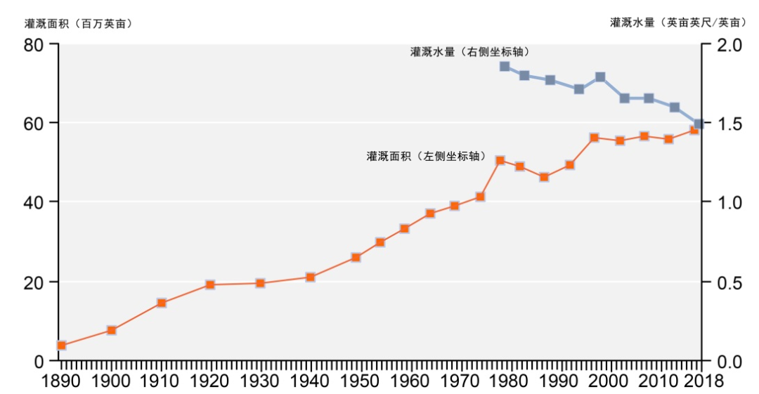 编者按:《2021年联合国世界水开展报告》提出,全球新水使用量在过去100年中增加了6倍,自20世纪80年代以来以每年约1%的速度增加。预计至2050年全球用水量仍将以类似的速度继续增长,且增长主要集中在中低收入国家,尤其是新兴经济体[1]。 为进一步把握好我国水资源未来需求趋势,我们深入分析研究了一些典型国家的用水态势变化情况及水资源管理经验,以期为我国实行水资源需求研判以及科学指导水工程规划建设给予参考。本公众号将研究成果以系列文章的方式陆续刊发,本文为系列研究之一,供业界同仁参考。 美国用水变化态势对我国的启示 姜富华 邢智慧 纪兴华 一、1950年以来美国用水量变化态势分析 (一)1950年以来美国用水量变化情况 2015年美国总用水量约为4449亿立方米,其中淡水约为3883亿立方米,占比为87%;咸水约为566亿立方米,占比为13%。 从1950年至2015年间美国总用水量的变化情况看,其总体呈先增后降的态势(见图1)。以1980年为转折点,1950-1980年间美国总用水量随着人口和经济的增长持续增长,1980年美国总用水量约为1950年的2.4倍;1980年以后,受产业结构调整、技术进步、用水效率提高等因素综合影响,美国总用水量呈现了总体下降的态势,2015年总用水量比用水高峰的1980年减少了约25%。 美国淡水取用量与总用水量变化态势一致(见图2)。1980-2015年间美国淡水总用水量下降了27%,此期间美国人口增长了约42%,GDP增长了5倍以上[2]。 数据来源:美国地质调查局统计。 注:①不同时段取水量统计口径略有差异;②取水量等于毛用水量。 图1 1950-2015年美国总取用水量及分类取用水量变化态势 数据来源:美国地质调查局统计。 图2 1950-2015年美国淡水取用水量与人口变化态势 有研究[3]绘制了以1950年为基准,至2010年美国GDP与用水量间的关系变化情况图(见图3)。蓝色线为实际GDP变化,橙色线为实际用水量变化,灰色线为考虑产业结构变化、不考虑技术改进情况下的预测用水变化。蓝色线与橙色线的剪刀走向表明:早在1980年,美国用水量已与GDP脱钩。蓝色线与灰色线、灰色线与橙色线的剪刀走向表明:导致脱钩的重要因素是用水效率提升和经济结构变化。 数据来源:数据来自[3];1950=1 图3 1950-2010年美国总用水量与经济变化关系分析 (二)主要行业用水量变化情况 美国用水类别中,热电、灌溉、公共和自供工业用水量是排在前4名的用水户,其用水总量占美国总用水量的比重超过90%,见图4。本文重点分析多年来美国热电、灌溉、公共和自供工业用水的变化情况。 数据来源:美国地质调查局。 图4 2015年美国分类取用水量统计 1.热电用水变化态势 热电是美国最大的用水对象。2015年美国热电用水量约为1838亿立方米,占总用水量的41%左右,见图5。美国热电用水基本来自地表水,且以淡水为主。2015年美国热电用水量比2010年降低18%左右,用水效率由2010年的71.9升/千瓦时降低到2015年的56.8升/千瓦时。 数据来源:美国地质调查局。 图5 1950-2015年美国热电用水量变化态势 2.灌溉用水变化态势 美国灌溉用水量占总用水量的40%左右,仅次于热电用水。2015年美国灌溉面积超过3.5亿亩,其中喷灌、微灌面积比重分别为55%和8.6%左右,灌溉总用水量约为1630亿立方米(占总用水量的37%左右),地表和地下水源灌溉供水比重分别为52%和48%。由于降雨丰枯变化,美国灌溉水量年际间有波动,但从大的变化趋势看,1980年以来总体呈下降趋势,2015年灌溉水量比1980年减少了21%,见图6。 数据来源:美国地质调查局。 图6 1950-2015年美国灌溉用水量变化态势 灌溉用水受水资源条件、灌溉面积、种植结构、灌溉设施、灌溉效率等多种因素影响。据美国农业部统计,美国灌溉面积快速增长,从1890年的不足1821万亩增长到2017年的3.52亿亩左右,见图7。但与此同时,实际灌溉用水强度有所下降,1969-2017年单位面积平均灌溉水量从406立方米/亩下降至304立方米/亩,这是农业种植模式调整、灌溉设施与技术采用和灌溉效率提高等综合作用的结果。 数据来源:美国农业部。 图7 1890-2018年美国灌溉面积和单位面积灌溉用水量变化态势 美国灌溉用水结构不断变化,主要表现为玉米和大豆的灌溉面积显著增加。1964年美国主要灌溉农作物是棉花和牧草,玉米和大豆加起来不到1518万亩。2017年玉米灌溉面积超过7284万亩,大豆灌溉面积超过5463万亩,见图8。 数据来源:美国农业部。 图8 1964-2017年美国主要农作物灌溉面积变化态势 同时,美国越来越注重高效节水灌溉技术的运用。美国农业灌溉主要集中在西部17州。1984年美国西部17州露天灌溉农田中使用高效节水灌溉系统的比重为37%,2018年该比例提高至72%,见图9。 数据来源:美国农业部。 图9 1984-2018年美国西部17州露天农田灌溉模式变化态势 3.公共用水量变化态势 美国公共供水对象主要包括家庭、商业和工业,以及部分公共服务用水等。2015年美国公共供水量约为539亿立方米(其中地表水源供水比重约为61%),占供水总量的12%左右。1950年以来,美国公共供水与总用水量、灌溉等用水总体呈先增后降的态势一样,但高峰用水出现时间后延至2005年,2015年美国公共供水量较2005年减少12.2%,见图10。公共供水中家庭供水比重最大,接近60%。 数据来源:美国地质调查局。 图10 1950-2015年美国公共供水量变化态势 美国家庭供水水源除了来自公共供水系统外,部分供水由自供设施解决。2015年美国顺利获得公